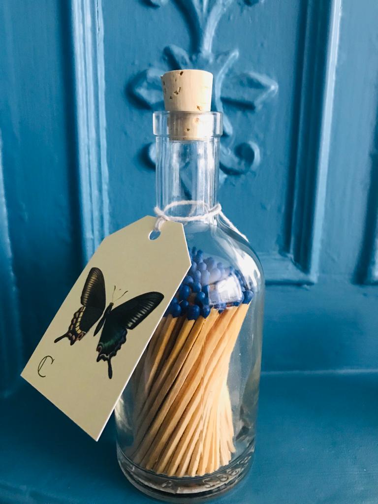 - 10 cm long matches, in glass bottle size 17cm (h) x 7.5cm (base diameter)