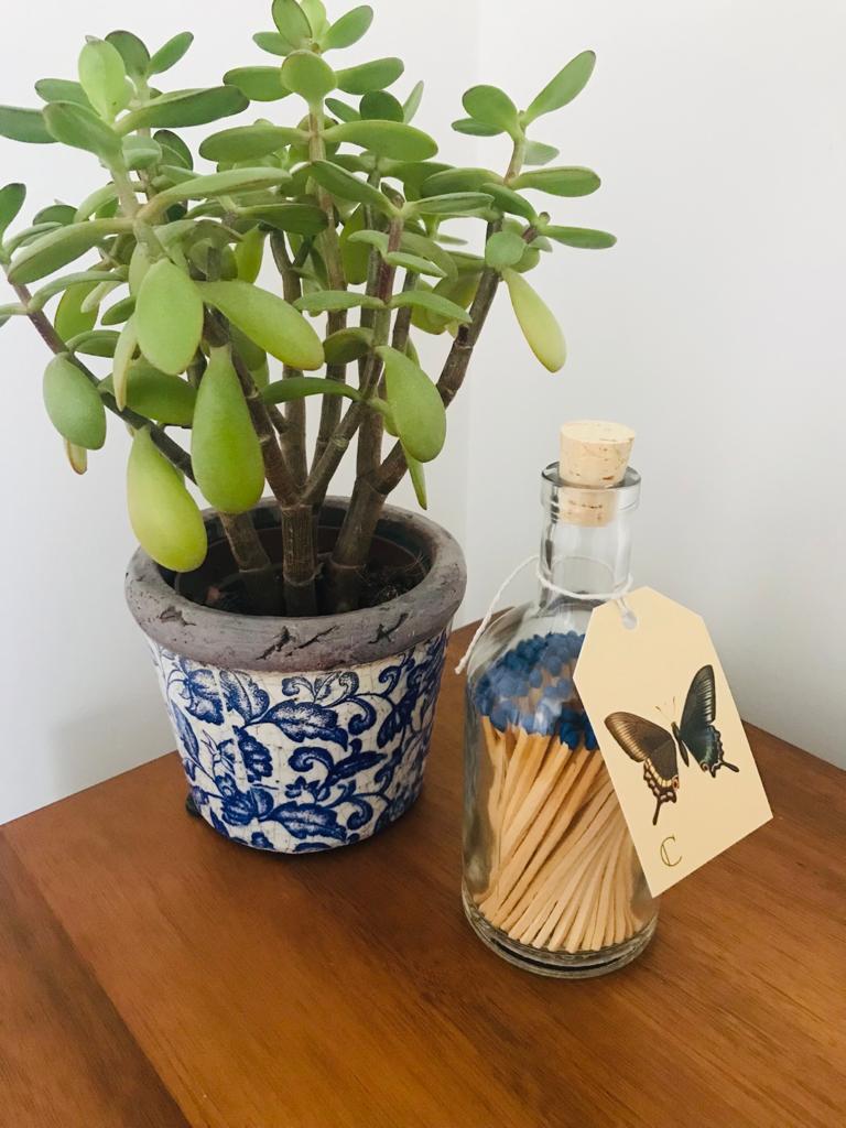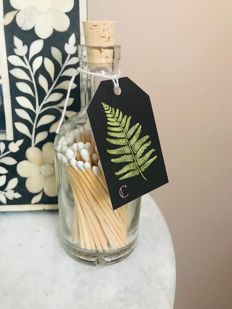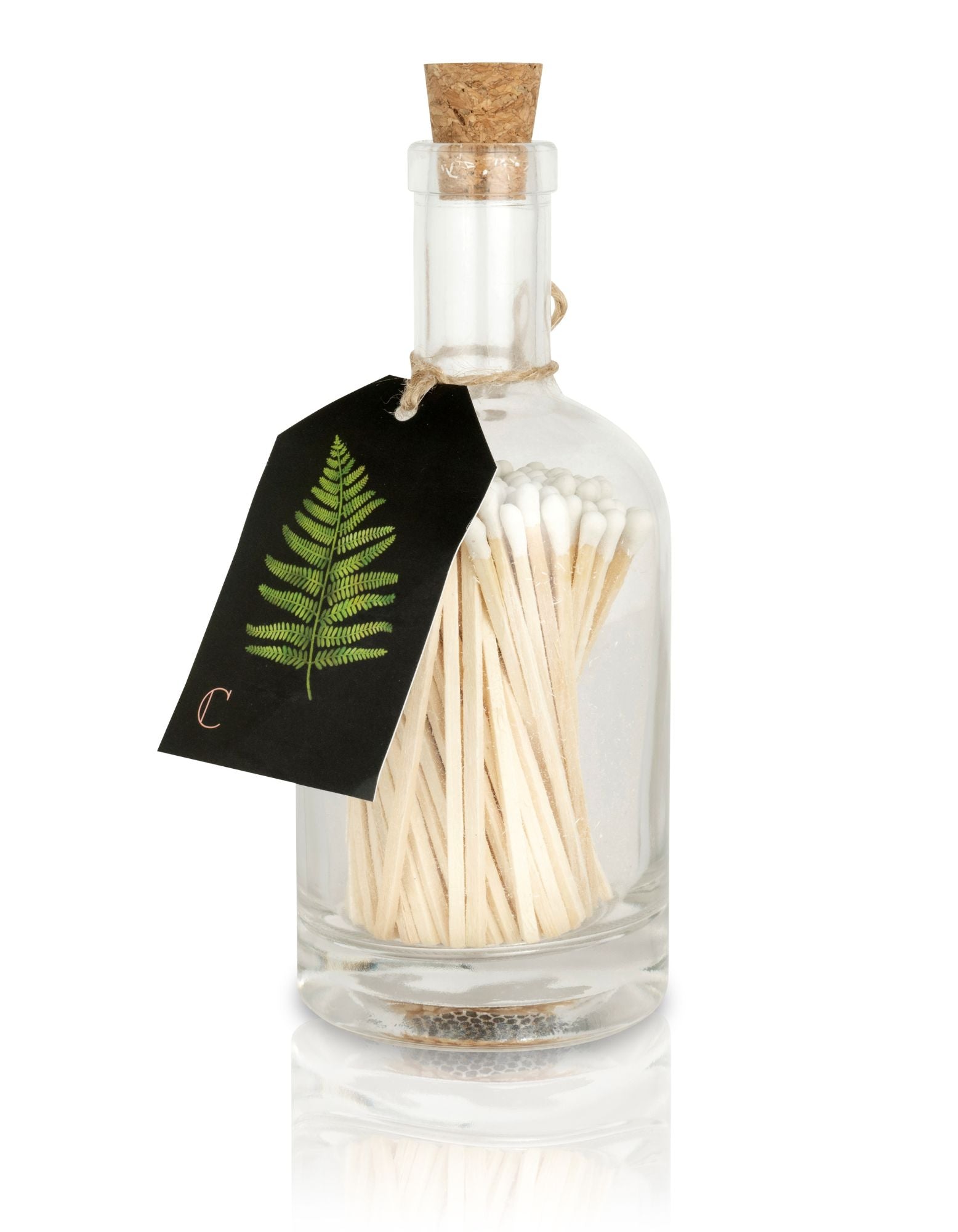 - Curator Home designer white tip safety matches stored in a glass apothecary bottle